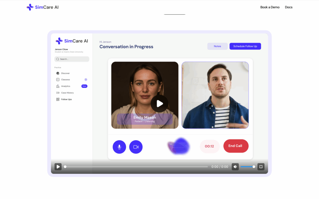 Role playing is outdated, inconsistent and slow. SimCare gives every student realistic, full counselling sessions with virtual clients, so they can practice skills and get feedback without needing a live partner